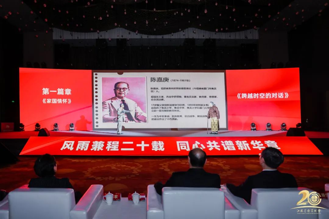 “中国民营企业家的先贤和楷模”张謇与“华侨旗帜、民族光辉”陈嘉庚穿越时光走来,微笑着好像从未离开,两人并立在舞台上徐徐展开一场“跨越时空的对话”。