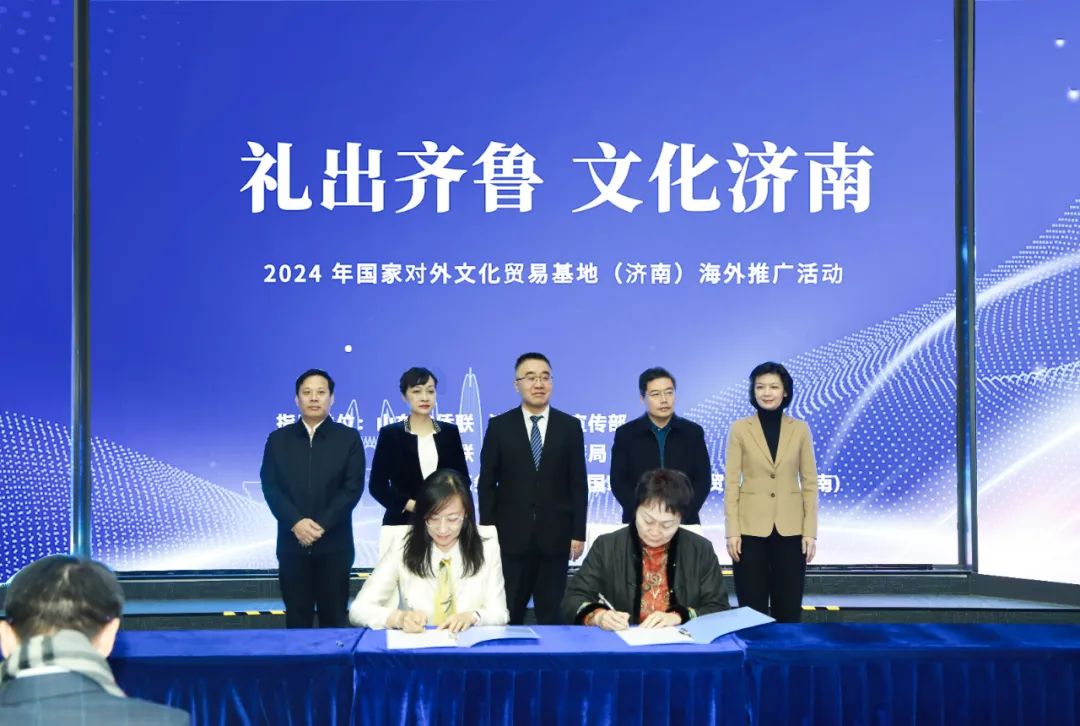 活动中,国家对外文化贸易基地(济南)运营方山东同程尚品传媒有限公司董事长赵华,分别与北京大学文化产业研究院院长向勇签署了“研究黄河文化创造性转化、创新性发展”的合作协议,与加拿大齐鲁华人总商会(侨驿站)会长郑燕、巴拿马山东商会会长刘科、韩国华侨华人联合总会代表周帅、中东欧中国科技交流协会(侨驿站)代表赵文波签署了“共建共享海外贸易推广渠道”的合作协议,与山东山科创业投资管理有限公司副总经理刘天娇签署了“共同开展‘礼出齐鲁 文化济南’品牌培育计划”的合作协议。活动现场,发布了“礼出齐鲁 文化济南”——2024 年首批文化出海系列产品。