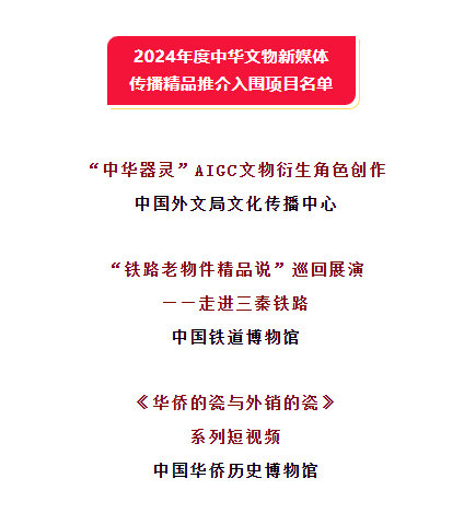 6月8日,在2024年文化和自然遗产日主场城市活动开幕式上,公布了2024年度中华文物新媒体传播精品推介精品项目、优秀项目和入围项目名单。侨博策划制作的《华侨的瓷与外销的瓷》系列短视频成功入围2024年度中华文物新媒体传播精品推介入围项目名单。