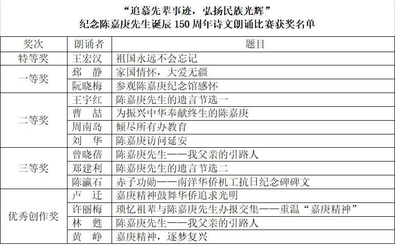 黄河清介绍了比赛情况,朗诵者中不仅有老归侨,也有侨二代、侨三代,年龄最大的87岁。朗诵题材有诗歌、纪念文章、碑文、解说词等多种形式,朗诵内容涉及嘉庚先生一生中的突出事迹、重要贡献,让观众在聆听中感悟嘉庚先生不平凡的一生和非凡的报国壮举,以此激励我们的爱国之志。