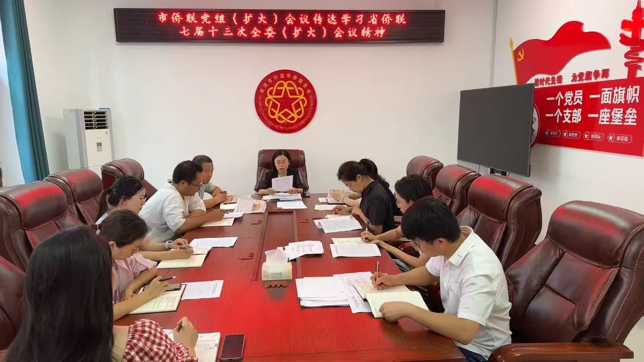 8月8日,黑河市侨联召开党组(扩大)会议传达学习黑龙江省侨联七届十三次全委(扩大)会议精神。市侨联党组书记、主席张小春主持会议并讲话,机关及所属事业单位全体党员干部参加学习。