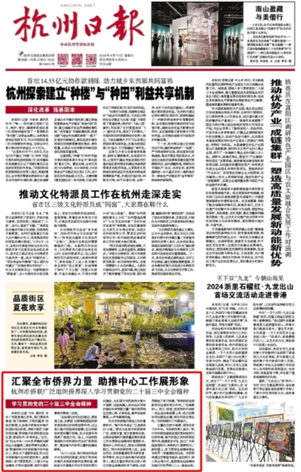 7月15日至18日,党的二十届三中全会在北京举行。这次会议,是在以中国式现代化全面推进强国建设、民族复兴伟业的关键时期召开的一次十分重要的会议。杭州市侨联通过各种形式组织广大归侨侨眷、海外侨胞、海归侨青等迅速兴起学习贯彻全会精神热潮,汇聚全市侨界力量,助推中心工作。一些特色亮点在省、市媒体刊发,本文转载自8月10日《杭州日报》头版。