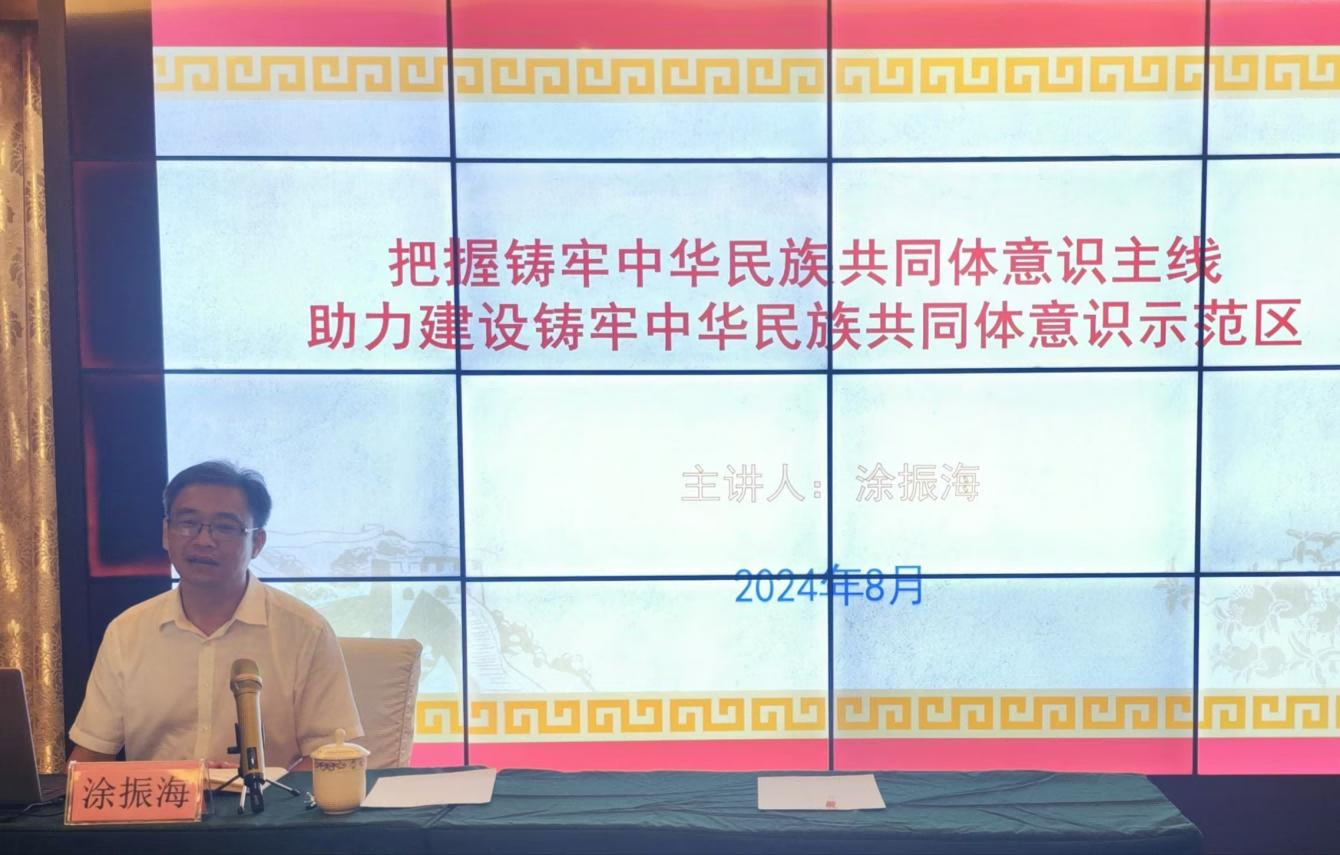 钦州市委统战部副部长、钦州市民宗委主任涂振海以“把握铸牢中华民族共同体意识主线,助力建设铸牢中华民族共同体意识示范区”为主题作辅导讲座。他围绕学习贯彻习近平总书记关于加强和改进民族工作的重要思想,深入阐明了铸牢中华民族共同体意识的重大意义和深刻内涵,并对抓好民族团结进步示范机关创建的实践要求作了全面、深入的解读。