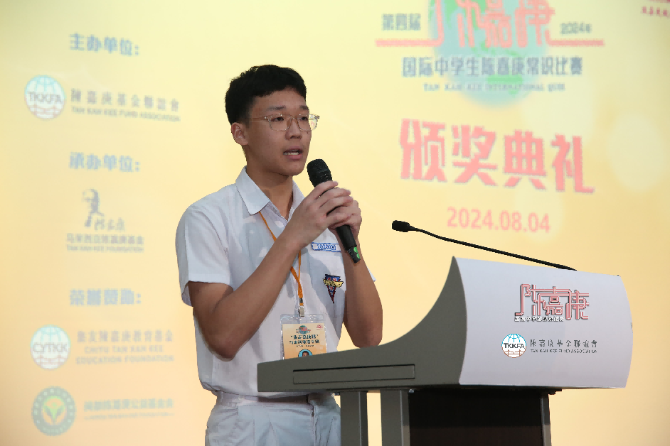 参团学生代表兼“最佳个人表现奖”得主李翊旸发表感言,表示自己曾经参与过四届“国际中学生陈嘉庚常识比赛”,从最开始初赛落选,到进入晋级赛16强,再到最后获得冠军和“最佳个人表现奖”,这一次次的进步都离不开家长和老师同学们的支持和鼓励。希望这场跨国赛事能够继续举办,让更多中学生了解陈嘉庚先生,感悟“嘉庚精神”。
