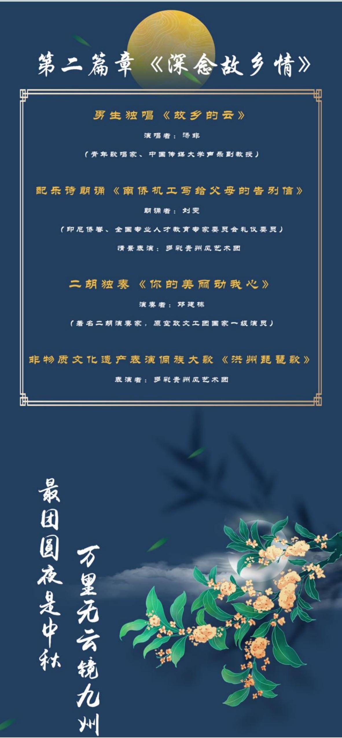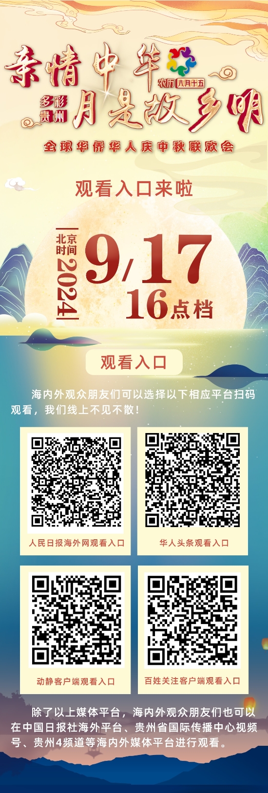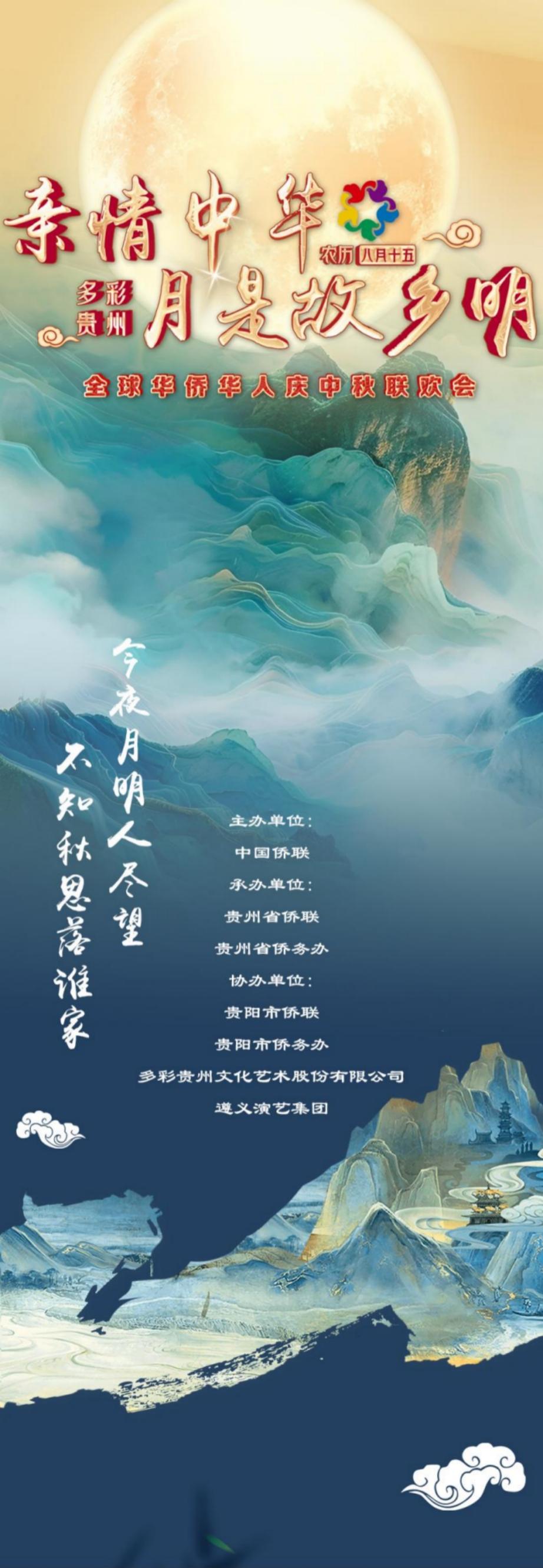 明天北京时间16时,“亲情中华·月是故乡明”全球华侨华人庆中秋联欢会正式上线,届时将通过人民日报海外网、中国日报社海外平台、华人头条、贵州省国际传播中心抖音号、贵州4频道、动静新闻客户端、百姓关注客户端等海内外媒体平台同步播出。