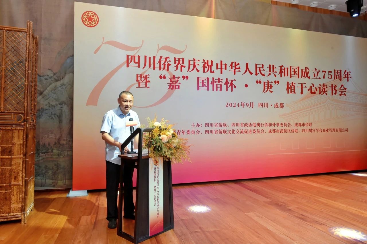 9月27日,由四川省侨联、省政协港澳台侨和外事委员会、成都市侨联主办的庆祝中华人民共和国成立75周年暨“嘉”国情怀·“庚”植于心读书会活动在蜀宫琴台音乐坊馆举办,省侨联主席杨东出席活动并致辞。