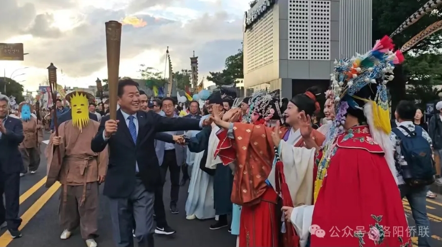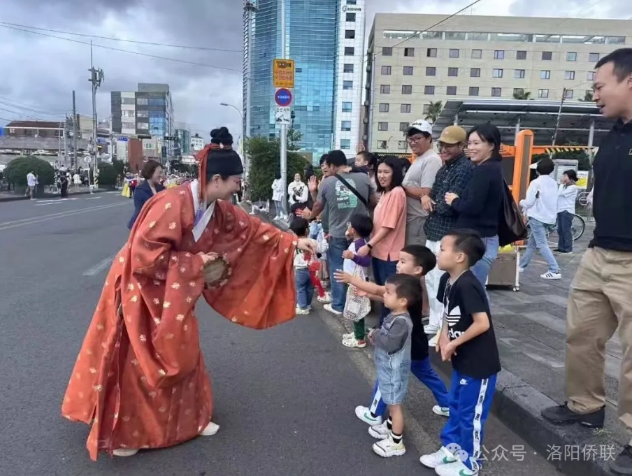 济州特别自治道知事吴怜勋在巡游路演中与“洛邑汉服艺术团”现场进行互动。身着汉服的卖货郎和牡丹仙子组合与围观群众游客互动、分发中国元素的小礼物,沿途吸引众多市民和游客围观,将古都洛阳和洛邑古城特有的沉浸式汉服文化体验感带到“东亚文化之都”济州岛,演绎出一场跨越时空的美丽邂逅。