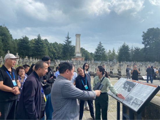 英魂无言,松涛阵阵。在松山抗战遗址,采访团一行向抗战英烈敬献鲜花,怀着激动的心情探访了目前保存最为完好的二战战场遗址。松山战役纪念碑前的中国远征军雕塑群由老兵方阵、娃娃兵方阵、炮兵方阵等13个雕塑方阵402座雕塑组成,古榕树上还保留着当年的弹孔,向今天的人们诉说着当年战役的惨烈。“我在参观中国远征军雕塑群时,巧遇一名穿着粉色衣服的女孩穿梭于娃娃兵方阵里,给塑像手里塞糖果。我看到在庞大的方阵里,塑像的手里、脚下,甚至是‘枪托’里,都塞满了五颜六色的糖果和零食。我想,这包含的不仅是人们对抗战英雄们的缅怀,更多的是心疼,他们用最直接和最质朴的行动在诉说着和平年代的人们对这些先烈们的感激之情。”采访团成员、尼日利亚西非统一商报副社长王淑华感动地说道。
