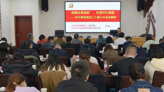 中共阿坝州委党校(行政学院)的苏茂华教授以“高擎改革旗帜 作答时代课题”为题,对党的二十届三中全会精神和省委十二届六次全会精神进行了深入浅出地剖析,紧紧围绕中央委员会全体会议讨论的主要内容,《决定》提出的“七个聚焦”和“六个坚持”,进一步全面深化改革和全面推进中国式现代化建设等重点内容,着重从“为什么改、向哪里改、怎么改”三个方面进行了全面系统地阐释。