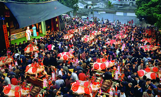 吃团圆饭,祭拜祖先,“压肚腰”:忠良温恭俭的潮汕人自小就被家中长辈教导注入传统文化观念,深谙“祖宗虽远,祭祀不可不诚;子孙虽愚,经书不可不读”的质朴道理。每年的腊月廿三(民间称小过年前夕),潮汕大地家家户户都会进行“彩屯”(打扫屋子),包括各家各户的祖宅老屋都会被打扮得焕然一新。到了除夕夜,主妇们都忙着卤鹅炊粿,精心准备做一年之中最丰盛、最富意义的团年饭。团年饭,顾名思义是一家人在过年时欢聚在一起吃饭,这是连故去的老祖宗也不能忘记的。因此,家家户户做好团年饭之后,首先必须“拜老公”(祭祀祖宗)。祭祖时应该将代表祖宗的香炉从神龛上请下来,安放在供桌上,然后焚香祷祝,请祖宗用餐。然后按长幼依序跪拜,这充分表现出潮汕人慎终追远、百善孝为先的传统美德。祭毕,将祭祖用的饭菜重新热过,设八仙红大桌于大厅,叔伯妯娌一家人团团围坐,家中长辈依次给每个小辈发压岁钱,这是每个家庭大团圆的美好时刻,一家人不论平时天各一方,或者平时有多少疙瘩,这个时候都应该欢声笑语,不能说伤心事或吵闹。给压岁钱是潮汕春节习俗中重要的一项,长辈要分钱给后辈,能挣钱的后辈也要送钱给长辈。这些钱不能直愣愣地送,而要很讲究地装在一个红色利是包中,或者用一块红纸包着,俗称为“压肚腰”,意味着一年从头到尾,腰包里都会满满实实、富富裕裕。特别有趣的是,小孩临睡前,父母必将一叠大面值钞票放在小孩肚兜中,睡醒后即将钞票取回,寓意小孩子平平安安长大。