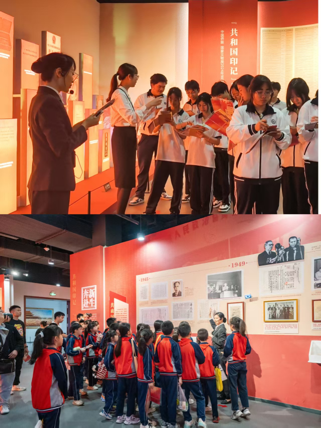 在开幕当天,侨博馆举办“共和国印记主题研学”活动,来自江门市美景小学、范罗冈小学以及江门技师学院的师生深入展厅开启红色文化浸润之旅。
