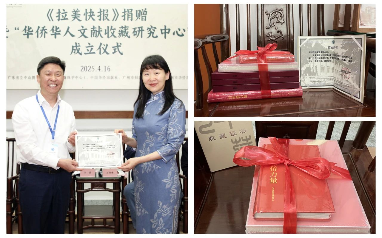 4月16日,《拉美快报》捐赠仪式暨“华侨华人文献收藏研究中心”成立仪式在广东省立中山图书馆举行。广州市归国华侨联合会党组书记、主席卞勇,广东省人民政府侨务办公室原主任吕伟雄,中国华侨出版社综合编辑室主任姜军,广东省立中山图书馆馆长方家忠,广州市华侨历史学会会长林干等出席仪式。