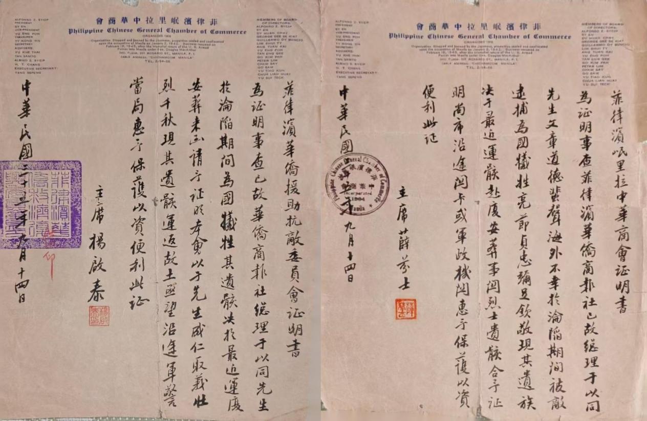历史文献类:菲律宾华侨援助抗敌委员会发给《华侨商报》总理事于以同的珍贵证明书等;
