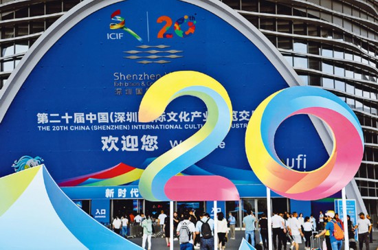 2024年5月23日,为期5天的第二十届中国(深圳)国际文化产业博览交易会开幕。本届文博会设8个展馆,共有超6000家政府组团、文化机构和企业参展,展出文化产品超过12万件,4000多个文化产业投融资项目在现场进行展示与交易。图为当日,观众步入第二十届文博会展馆。