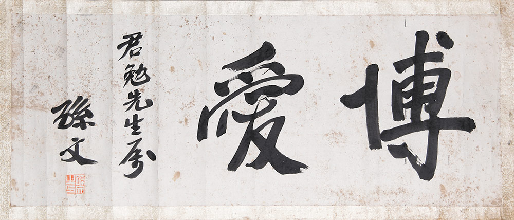 广东中国客家博物馆收藏的“博爱”题词是孙中山于民国初年在日本题赠给华商潘君勉的,以感谢潘君勉先生多次捐款大力支持民主革命事业,同时借此再次宣传博爱精神。此书法作品为纸本、横轴,长98厘米,宽38厘米,整体完整,但霉点严重。尾款写“君勉先生属”,题识、钤印皆与中国华侨历史博物馆的“博爱”题词相同。整幅作品一笔一画用笔端庄规范,几无潦草,形体方正,宽博厚重;用墨饱满,没有枯笔,棱角圆润,线条流畅,韵味悠长。