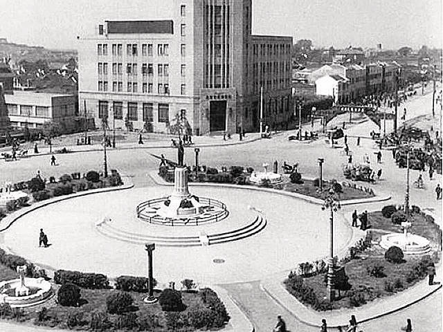 据1929年5月31日出版的第三十六期《首都市政公报》记载,“于中山路与子午线路在新街口交叉地点,设一广场”,这是我能找到的关于新街口广场最早的文字记录。1931年1月20日,新街口广场竣工,因是南京市内第一座广场,所以也称第一广场。上图是20世纪40年代新街口广场的模样,平面呈正方形,边长100米,中间是直径16米的草坪,向外依次是弹石停车场、草坪、沥青车行道、混凝土人行道。从建成那日起,这里就是南京最热闹繁华的所在,饭馆、酒店、报馆、戏院林立。20世纪40年代,众多银行齐聚此处,成为当时中国的“华尔街”。这张20世纪40年代的新街口广场图片,可以很明显地看到广场中心矗立着孙中山先生像,说起这雕像,可颇有故事……