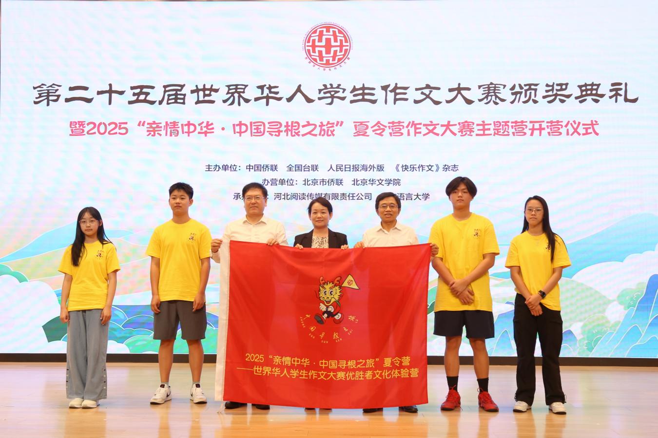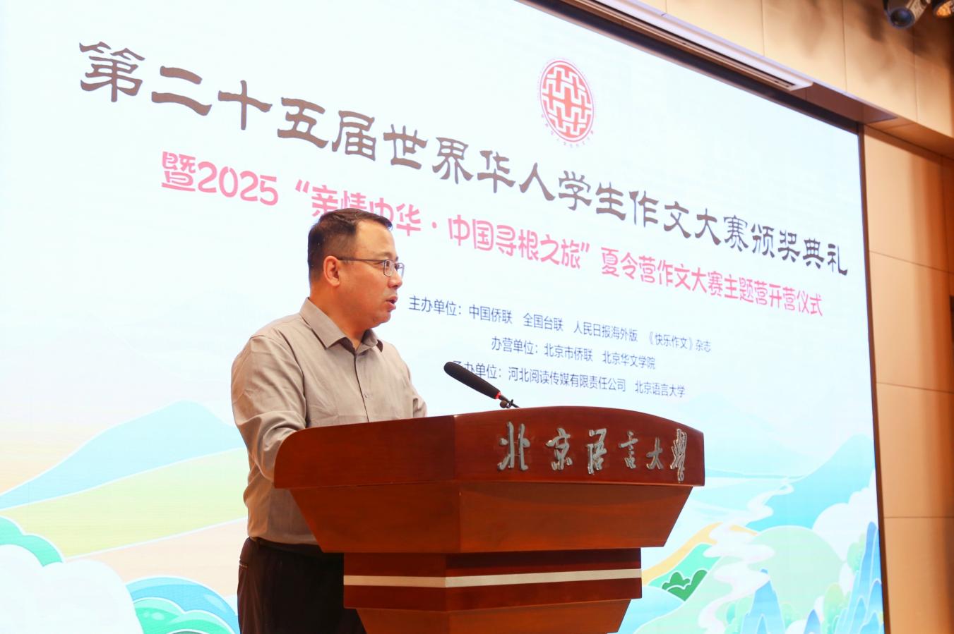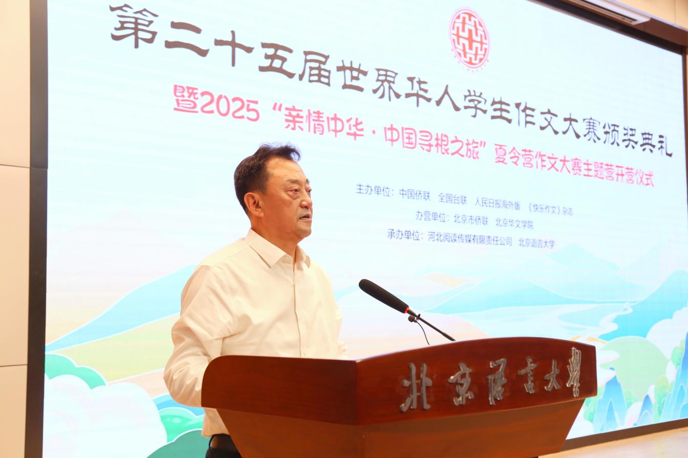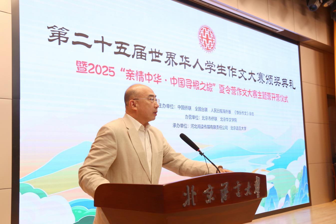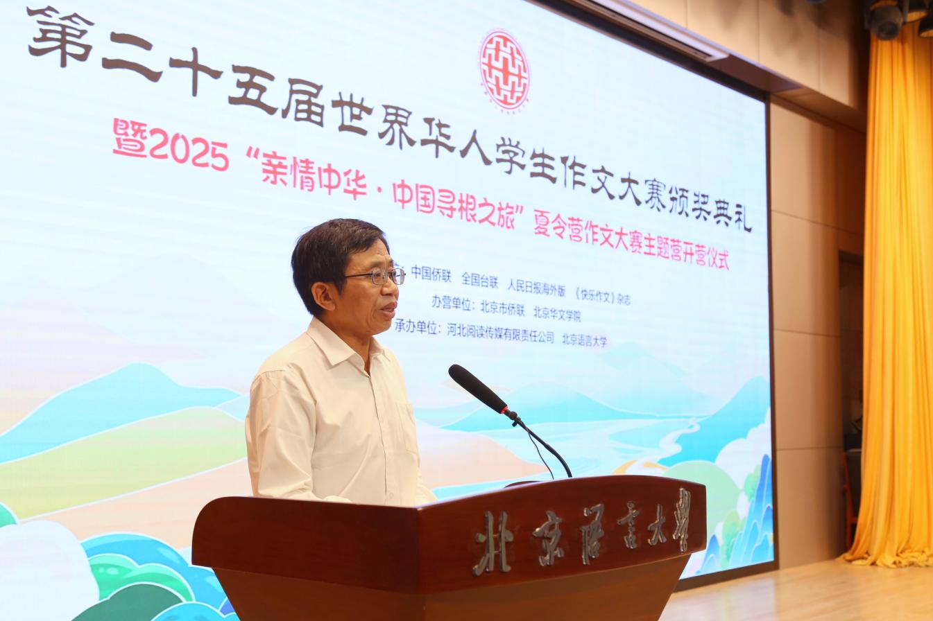 以青春之我,筑中华之梦。7月20日,由、全国台联、人民日报海外版、《快乐作文》杂志共同主办的第二十五届世界华人学生作文大赛颁奖典礼暨2025“亲情中华·中国寻根之旅”夏令营作文大赛主题营开营仪式在北京语言大学举行。党组成员、副主席候选人高峰,全国台联党组书记、兼职副主席纪斌,人民日报海外版科教部副主任熊建和世界华人学生作文大赛组委会秘书长、河北阅读传媒公司总经理关平等主办单位领导,北京市侨联党组书记周景晓、北京华文学院党委书记张衍前、北京语言大学党委书记倪海东等承办单位主要负责同志出席活动。北京语言大学教授、第十届茅盾文学奖获得者、大赛专家咨询委员会顾问梁晓声出席活动并授课。文化交流部副部长郭启华主持颁奖仪式。