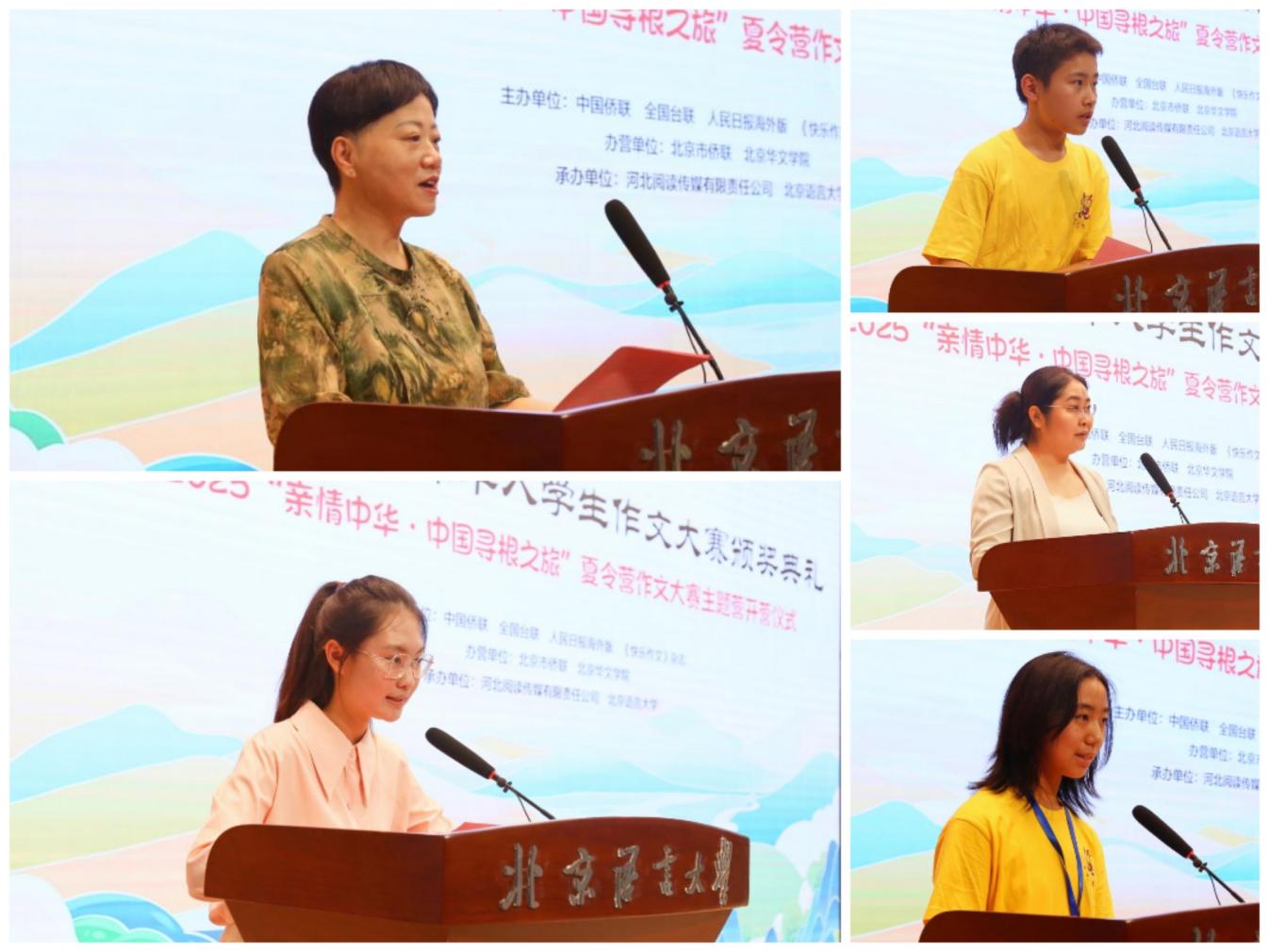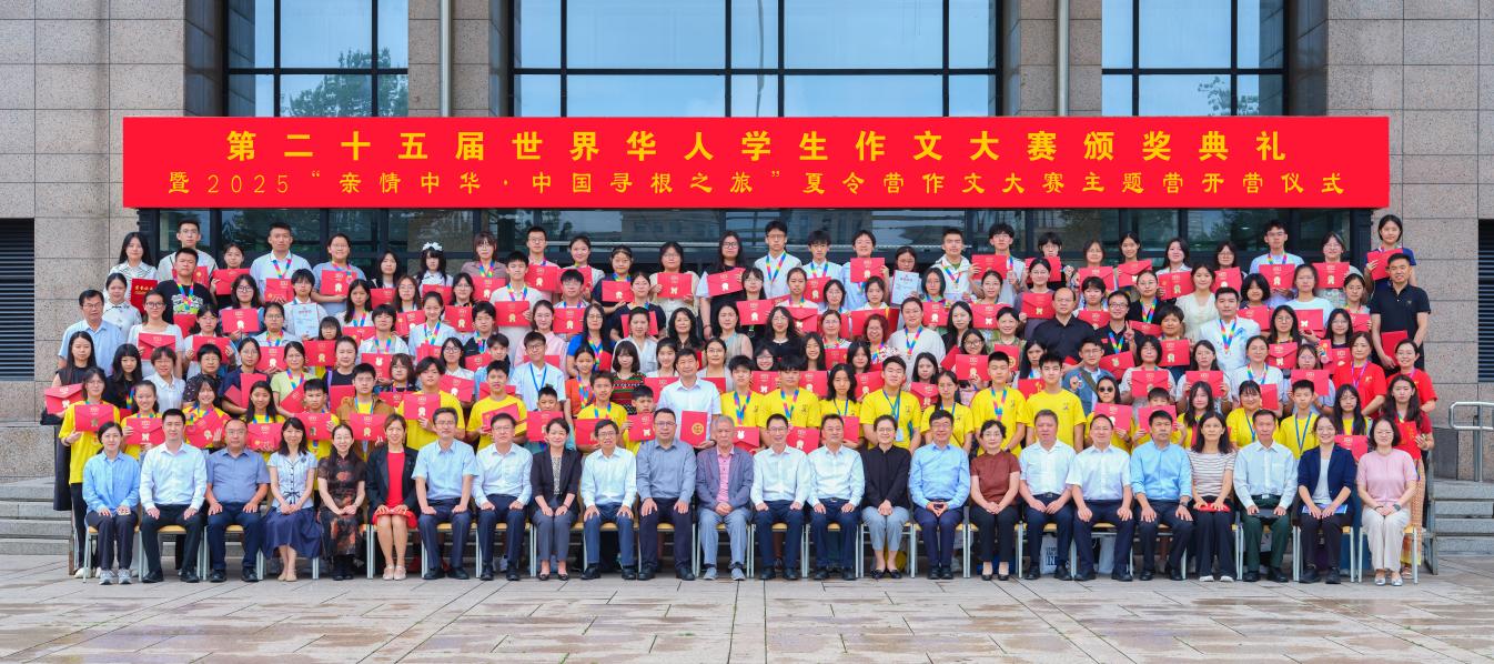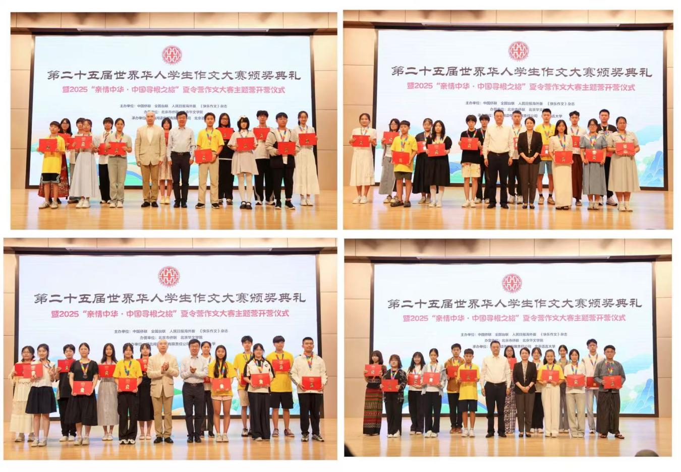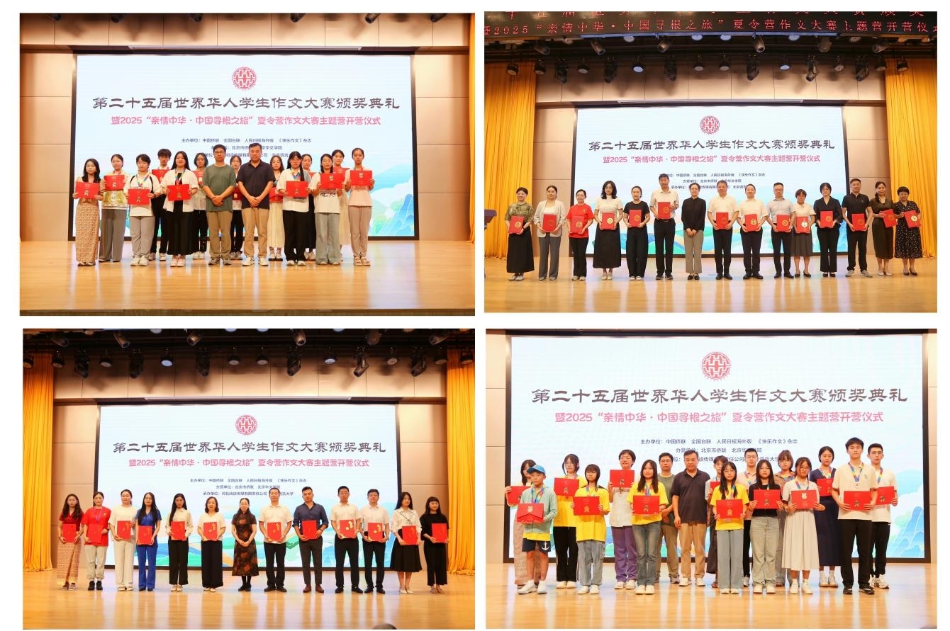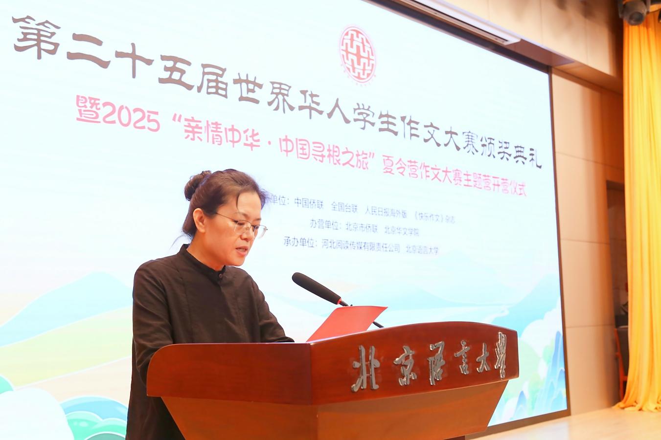 以青春之我,筑中华之梦。7月20日,由、全国台联、人民日报海外版、《快乐作文》杂志共同主办的第二十五届世界华人学生作文大赛颁奖典礼暨2025“亲情中华·中国寻根之旅”夏令营作文大赛主题营开营仪式在北京语言大学举行。党组成员、副主席候选人高峰,全国台联党组书记、兼职副主席纪斌,人民日报海外版科教部副主任熊建和世界华人学生作文大赛组委会秘书长、河北阅读传媒公司总经理关平等主办单位领导,北京市侨联党组书记周景晓、北京华文学院党委书记张衍前、北京语言大学党委书记倪海东等承办单位主要负责同志出席活动。北京语言大学教授、第十届茅盾文学奖获得者、大赛专家咨询委员会顾问梁晓声出席活动并授课。文化交流部副部长郭启华主持颁奖仪式。
