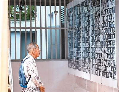 在吉隆坡南侨机工纪念馆内,一名老人观看南侨机工照片墙。
