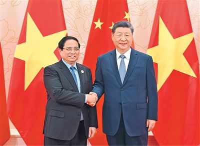 习近平指出,我今年4月对越南进行国事访问,双方就新形势下推进中越命运共同体建设达成重要共识。两国各部门各地方要加紧落实,推动中越全面战略合作取得更多实质性成果。面对加速演进的百年变局和变乱交织的国际形势,中越要坚定道路自信和制度自信,加强团结协作,推动中越命运共同体航船始终沿着正确方向稳步前行。