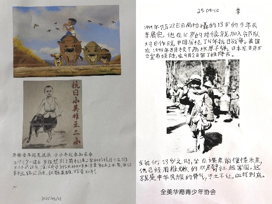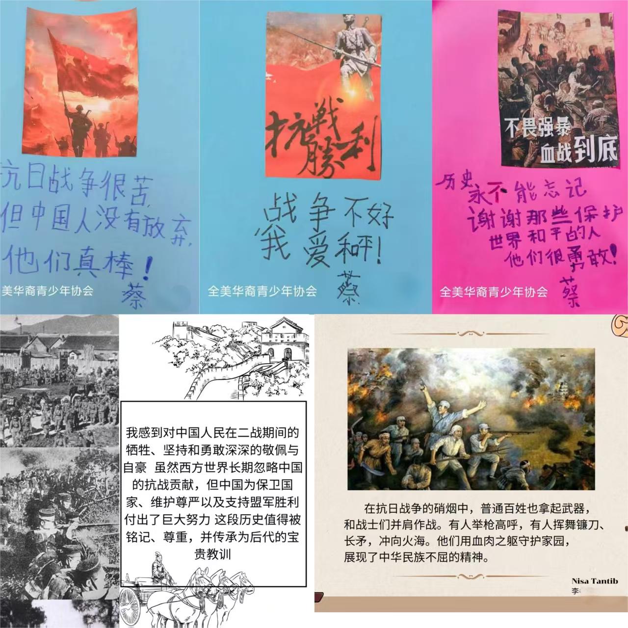 《中国贡献》一课分为“中国,被遗忘的盟友”“中共,中国抗战的中流砥柱”“中华儿女,浴血山河的胜利碑铭”三个小节,帮助海外华裔青少年了解中国对世界反法西斯战争的历史贡献,理解中国共产党在抗战中的中流砥柱作用,树立正确二战史观。课后,海外华裔青少年们创作提交了丰富多彩的作品,通过文字、图画、海报等多种形式,生动记录学习心得,将历史认知转化为情感认同。