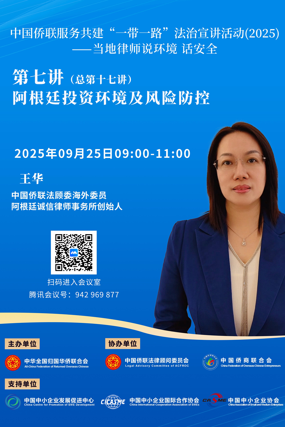 今年第七讲(总第十七讲)将于2025年9月25日(周四)9:00开播,由法顾委海外委员阿根廷王华律师主讲。王律师毕业于阿根廷美洲大学,获得国际贸易硕士学位,持有律师执照和阿根廷国家公认中西文翻译资格证。王律师专注于公司法、海关法、国际贸易和移民法等,近年来在中资企业投标、重组、并购、索赔、公证等方面提供全方位法律服务,助力中资企业“走出去”。王律师还同时兼任阿根廷华侨华人妇女联合总会会长、中国驻阿根廷大使馆领事部法律顾问、阿根廷布宜诺斯艾利斯大学法学院特聘教授等职务。