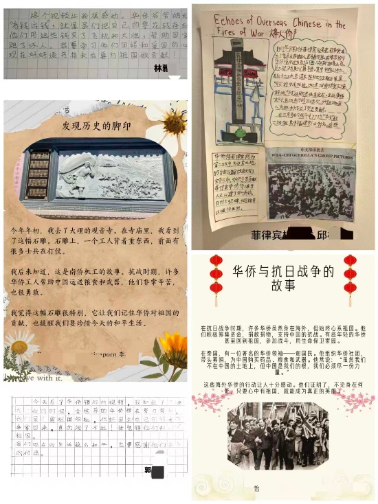 “在抗日战争时期,许多华侨虽然身在海外,但始终心系祖国。他们积极筹集资金,捐款捐物,支持中国的抗战。有些年轻的华侨甚至回到祖国,参加战斗,用生命保卫家园”,来自泰国丝路国际教育的怡同学表示,“这些海外华侨的行动让人十分感动。他们证明了,不论身在何处,只要心中有祖国,就能成为真正的英雄。”泰国丝路国际教育的李同学说:“我们要记住华侨对祖国的贡献,也提醒我们要珍惜今天的和平生活。”意大利新玉语言学校林同学表示:“我要学习他们团结和爱国的心,现在好好读书,将来也要为祖国作贡献!”