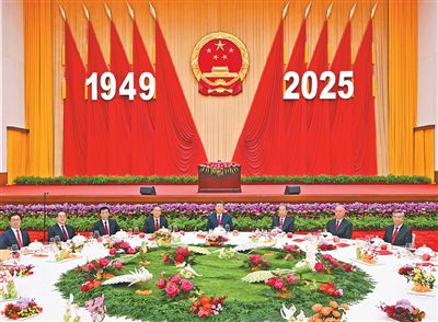 人民大会堂宴会厅华灯璀璨,洋溢着喜庆热烈的节日氛围。主席台上方高悬着庄严的国徽,“1949—2025”大字年号在鲜艳红旗映衬下格外醒目。