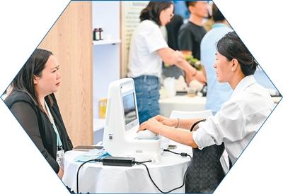一名参观者(右)在第七届中国—阿拉伯国家博览会现场体验中医经络检测仪。