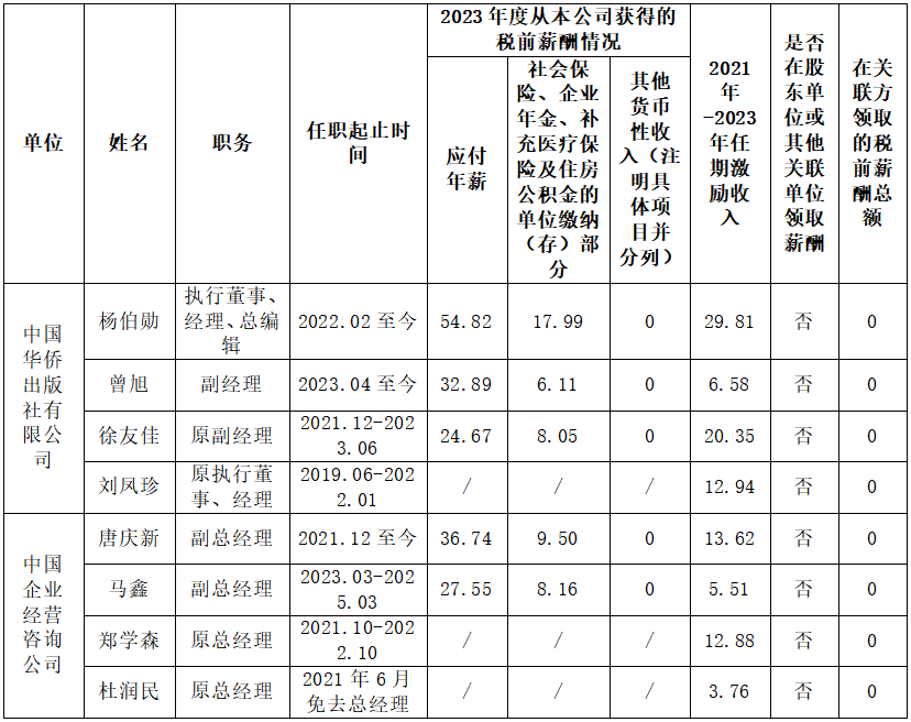 备注:上表披露为我会所属企业负责人2023年度全部应发税前薪酬(不含发放的以往年度绩效年薪)。